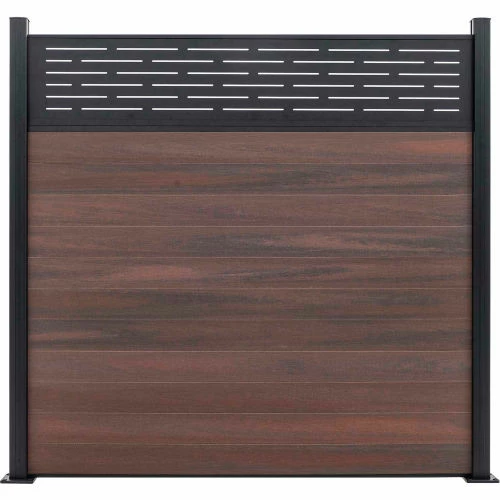 Beauty of wood without the maintenance, never needs paint or stain. Mixed materials, aluminum and composites, both low maintenance with UV protection. All-purpose, strong, lightweight, and rot free aluminum framework and posts. Locking tongue & groove composite and aluminum boards mix and match. Composite color families are multi-chromatic with heavily embossed grain. Composite is made of recycled wood and polyethylene. Gate kits sold separately. Manufactured in the USA and Canada. Installation video and PDF available.